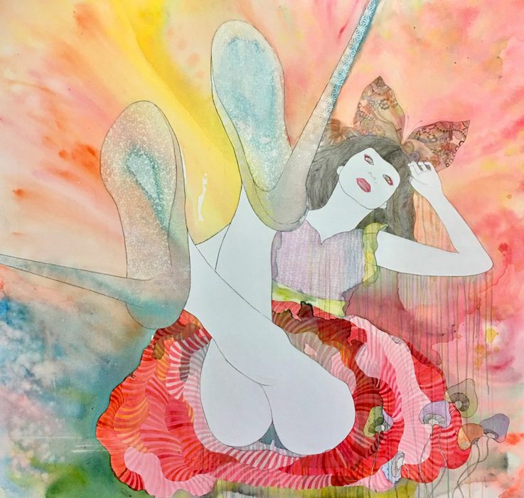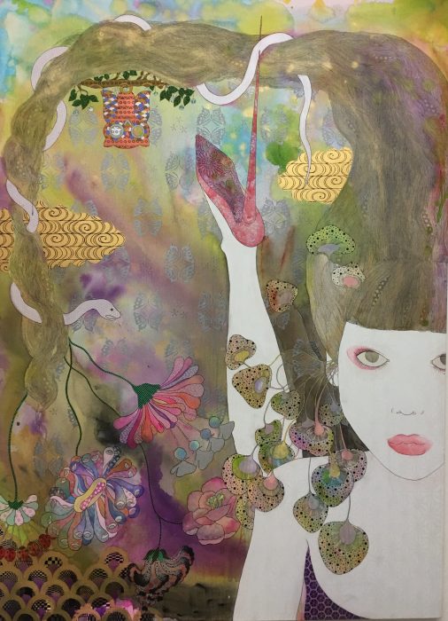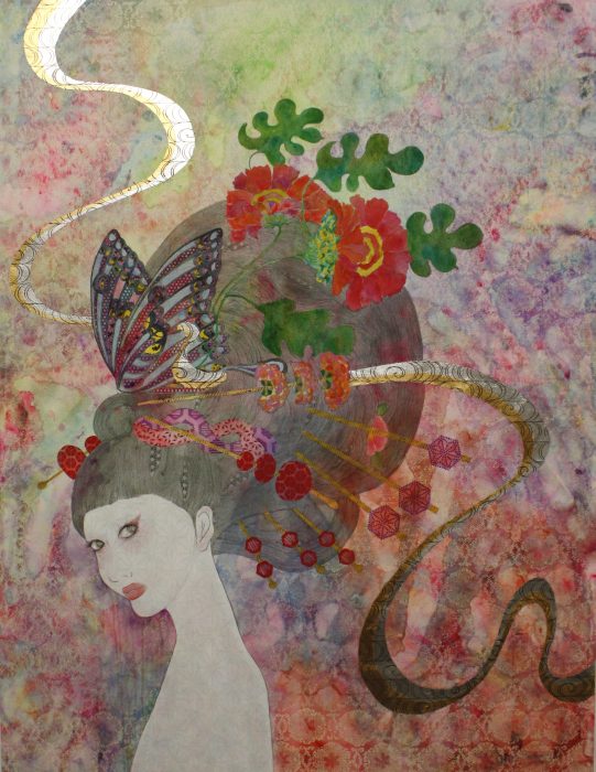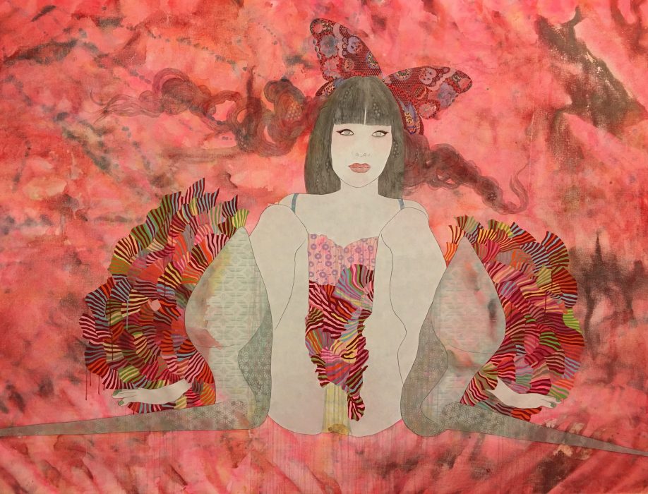 A former teen pop star with a burgeoning artistic career, KAORUKO explores the complex identity of Japanese women, caught, as she sees it, between tradition and modernity. She combines references to pop culture and ukiyo-e (traditional Japanese woodblock prints) in her large-scale paintings, in which she depicts languid, lingerie-clad young women in intimate domestic spaces, against silkscreened backgrounds of traditional kimono patterns. The women in KAORUKO’s “Aromako” series (2011), for example, are shown calmly smelling various parts of each other’s bodies, while staring straight out of the canvas, meeting our gaze straight on. As KAORUKO explains: “I tried to use this type of confrontational imagery to express my thoughts on Japanese culture in its relation to the role that women play, both socially and politically, in [the] present day in contrast to our history.”
