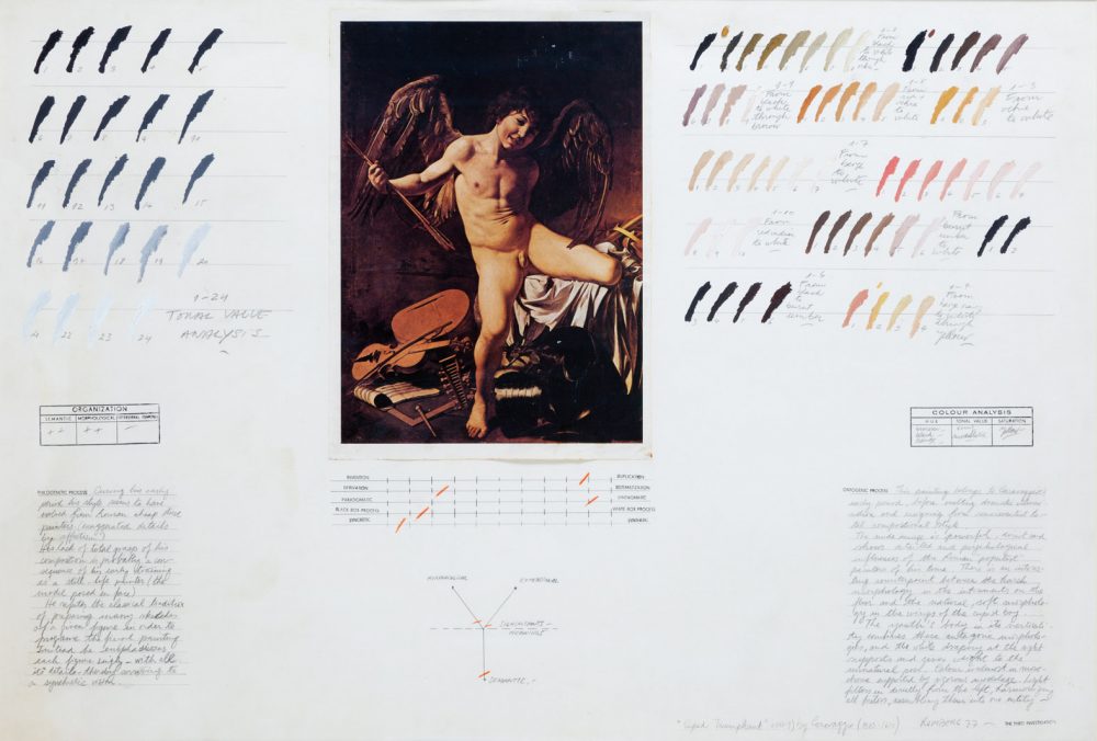 In the early 1970s, as a painter and conceptual artist, he began using a grid to analyze the tone and saturation of various colors. Romberg’s deconstruction of both individual hues and those of famous historical paintings investigate the political and social conventions of looking and seeing. The works on paper from this period are infused with Romberg’s interest in art history, philosophy, linguistics, and informational systems.