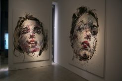 Pasqua’s painting strikes the visitor like an almost physical impact, but also like a vision that is at the same time explosive and incisive. The monumental format of the artist’s canvases is dictated by the breadth of his gestures – a dance where brutality and finesse, trance and lucidity alternate. He begins by painting the sort of fetishes or enigmatic silhouettes that evoke voodoo. Then, gradually, his gaze turns to those who are standing around him. He interferes with the twists and turns of people’s intimate depths, going right into the innermost areas of their being. As a counterpoint to this physical work, there are his grand drawings. The face or the body becomes a halo, mist, smoke, stroke, vibration. It is no longer so much a case of flesh as of sketched contours and delicate textures.