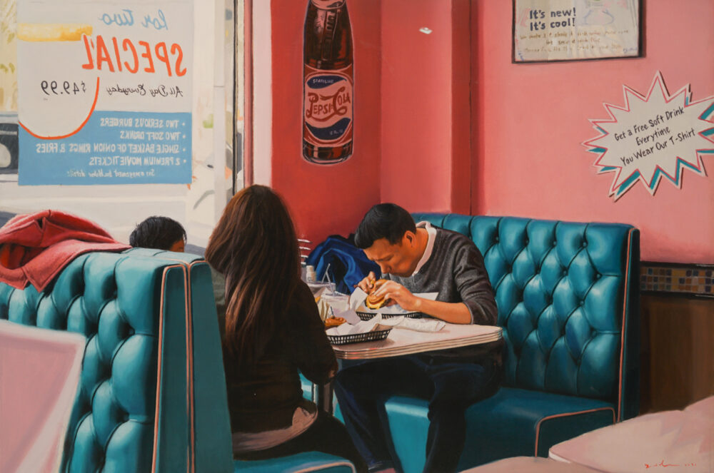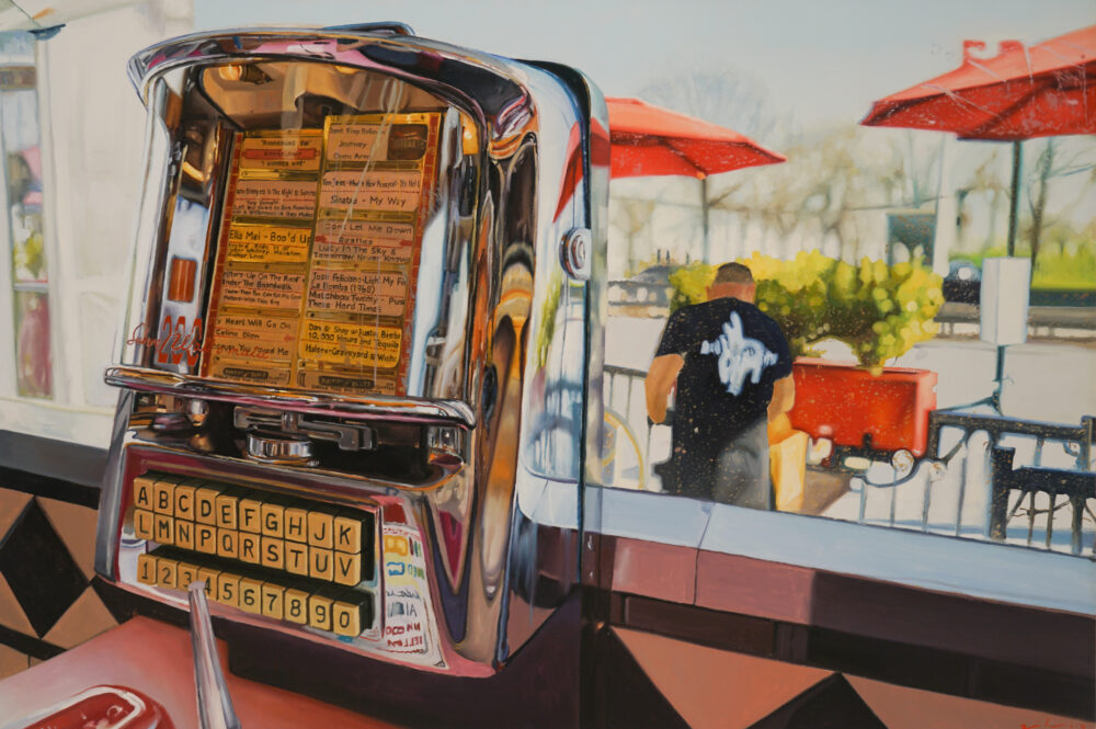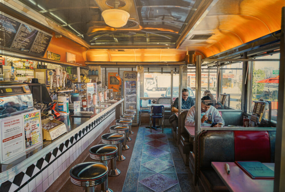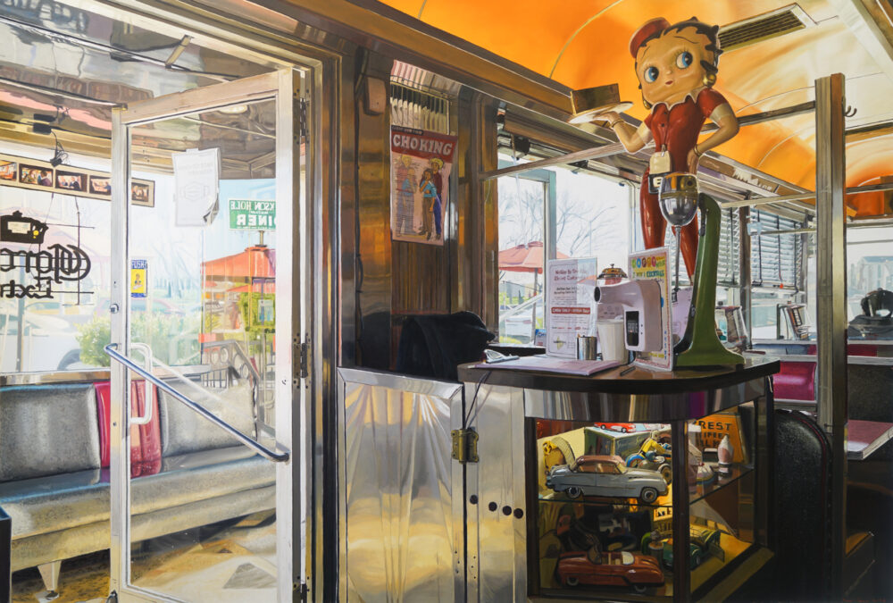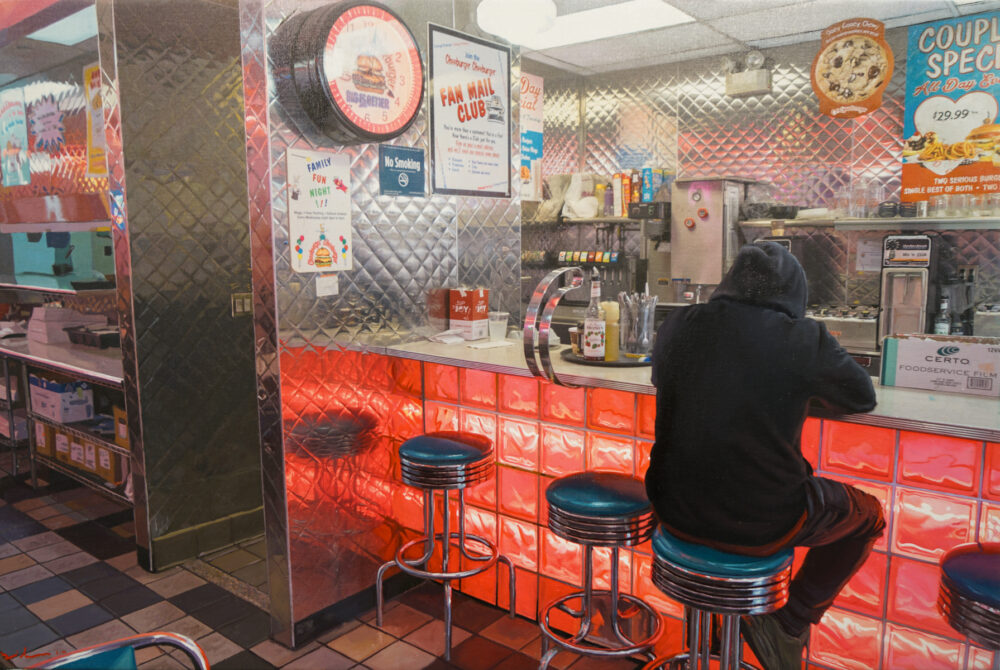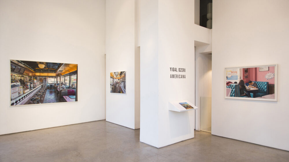 In the current exhibition Americana, Ozeri has chosen to focus on ‘the diner’ as an American icon; an institution that has its image engraved into the fabric of American life. Ozeri aesthetically captures the most appealing retro-elements from the furniture to the lighting. The chrome accessories reflect pops of neon and bold lines of vibrant colors. Vintage antique memorabilia make their way into the composi- tions adding a charming nostalgia of yesteryear.
