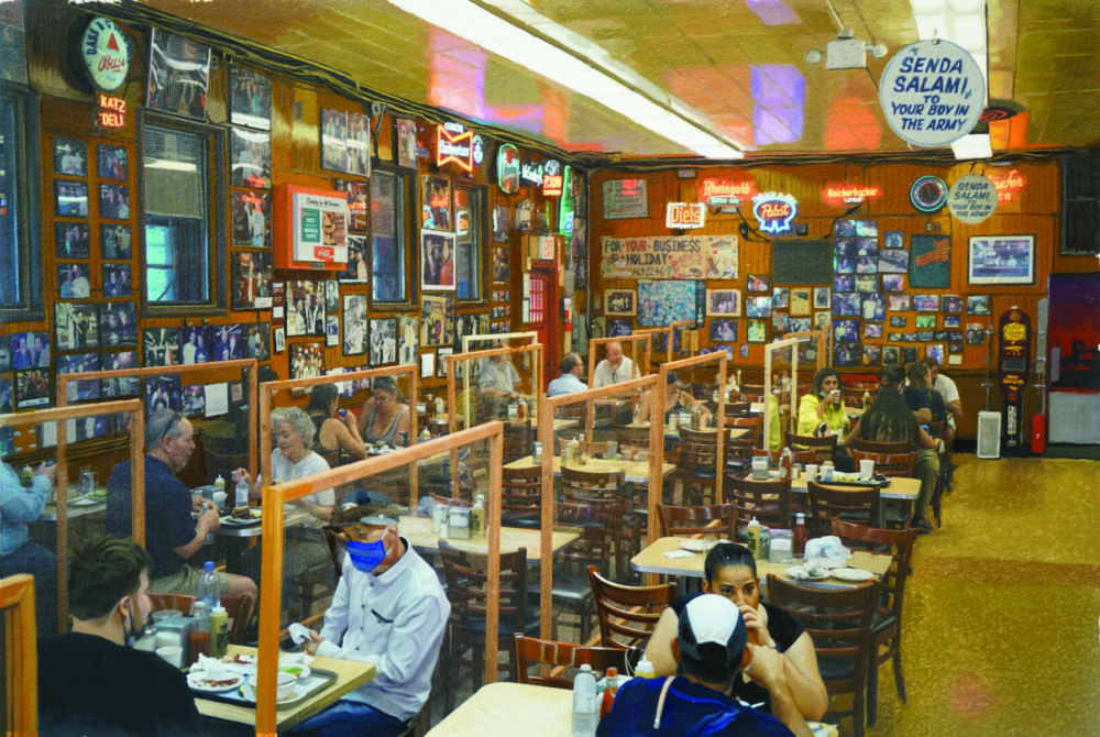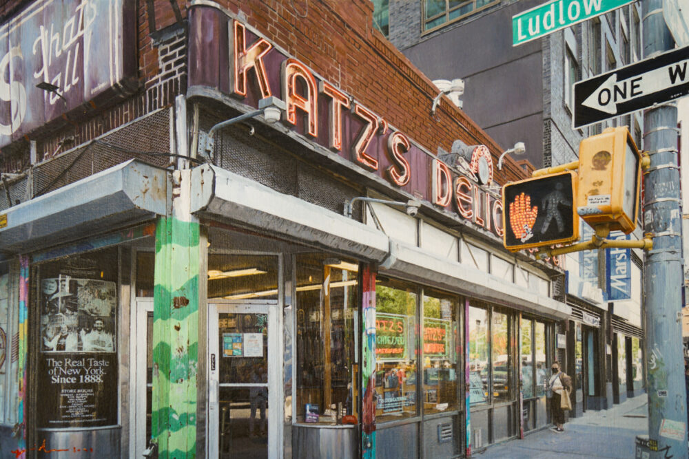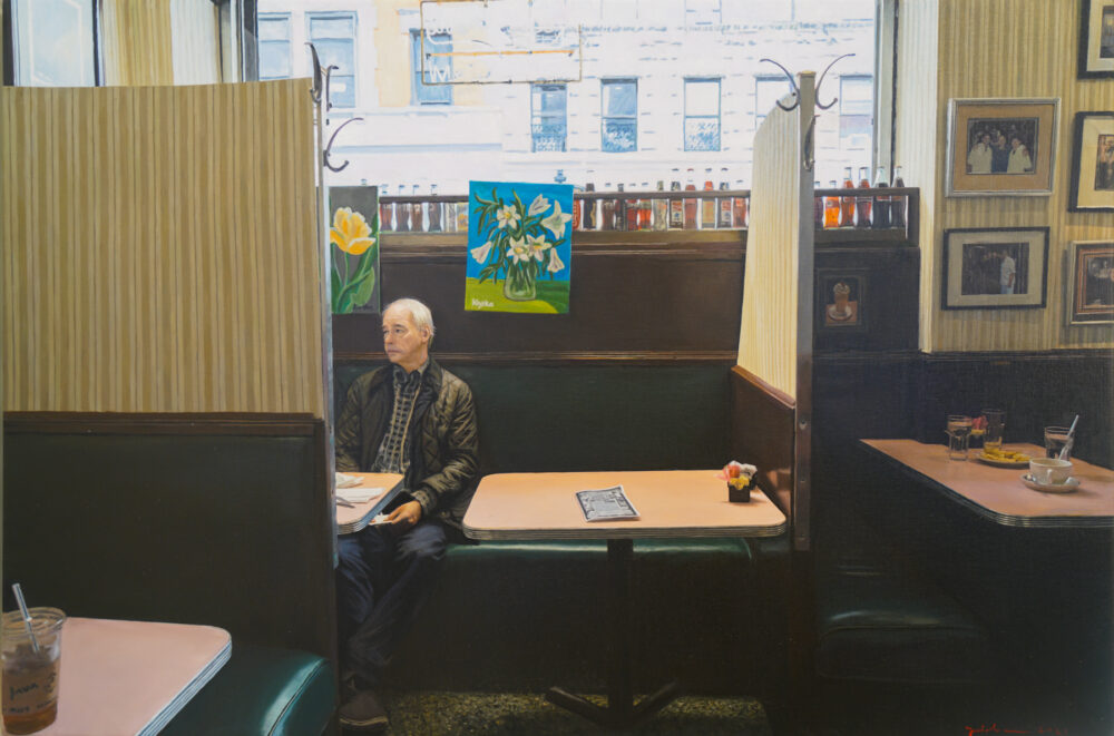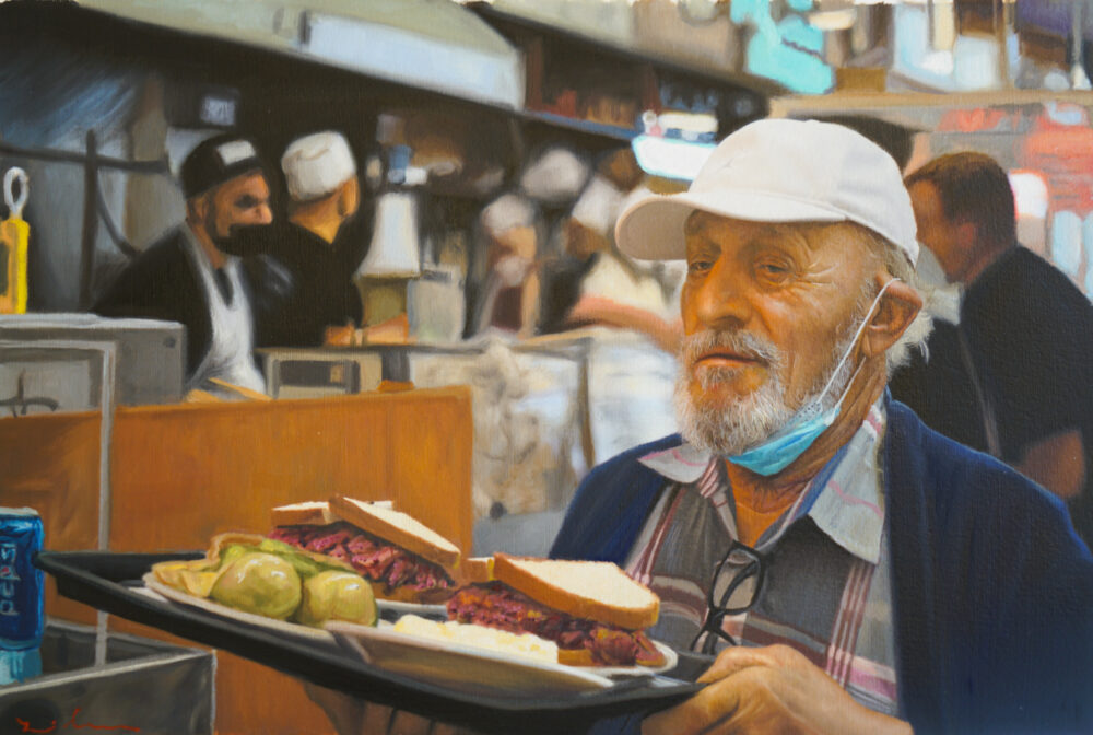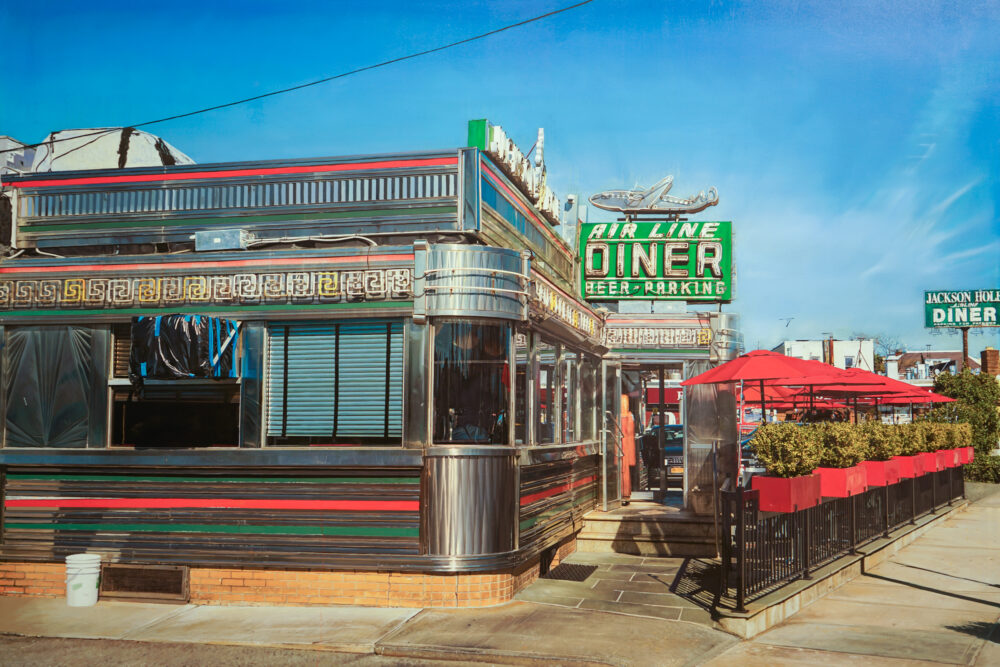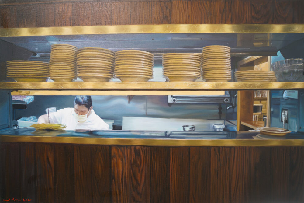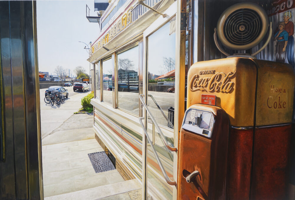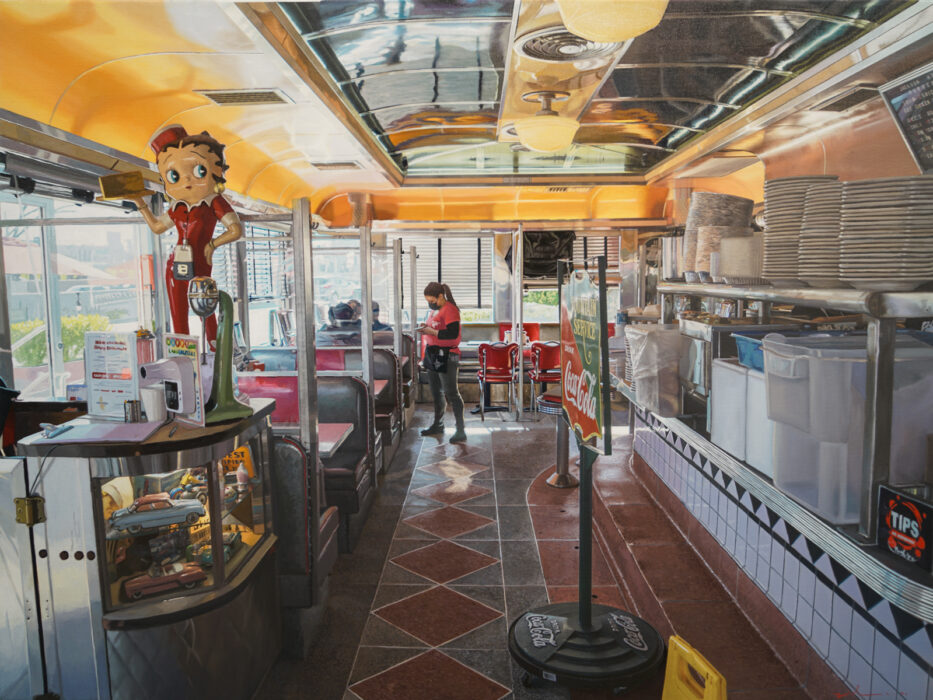 As an added component to the classic undertone of his paintings, in this series Ozeri includes contemporary details that will be forever etched in our collective psyche, making it timeless and time specific simultaneously. There are subtle nuances of COVID 19 implications from a waitress wearing a face covering, to a thermometer check in the entrance, to a “barely there” sign in the window requiring patrons to wear masks. Ozeri juxtapositions the new with the old making this series multifaceted and complex. He remains true to his painting approach combining sharp detailed brushstrokes with abstract constituents. Illuminated by visceral imagery of retrospective architecture and interiors, his paintings come to life capturing the space between the physical and the abstract.