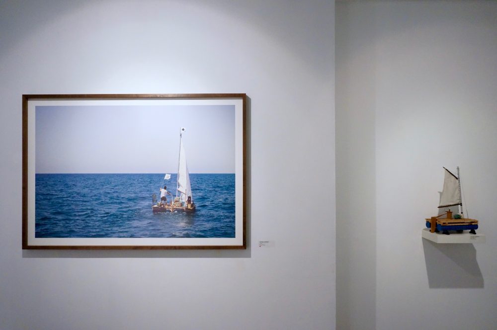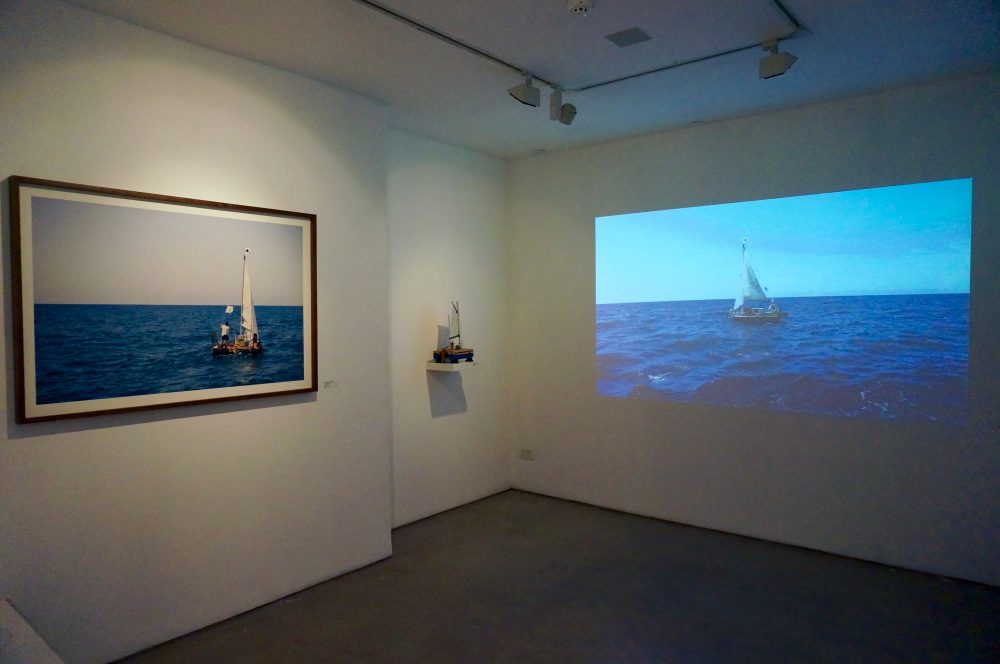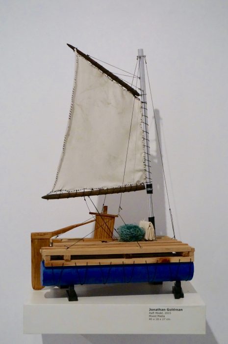 The next project Goldman worked on is the The West Border, which holds the conceptual tier of the lab for growing floating mountains. While the first project took place in the confines of the lab, in the second project the artist stepped out into the field, conflating the role of survivor with the role of scientist in a voyage at sea on a raft he had built in the studio over several months. The journey followed the Israeli coastline – the country’s western border. During the voyage, Goldman realized his vision and planted the mountain fetuses he grew in his lab on the seabed, in the hope that they will rise and emerge from the surface of the sea and form new dimensions of existence. The voyage at sea was documented in the video work The West Border, which shifts along the axis between documenting the artist’s action, to a video work that recounts the fictional story of a survivor-scientist, who tries to grow alternative continents on which we could begin a new life.