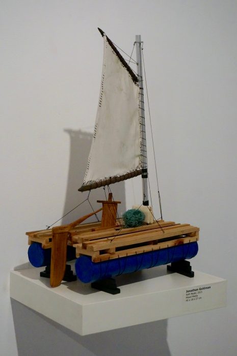 The title of this show, Back to Shore, demonstrates the current state of the artist: one step after the voyage at sea, in which he had returned to shore, drew conclusions, and came up with new insights. The exhibition encompasses the three incarnations of Goldman’s work and unfolds an evolution of an idea through the creative process. The process started in his exploration into the link between sound and shape, engendered the image of the floating mountains, evolved into the idea of a lab for growing new continents, and from there to a journey at sea on a raft and back to the notion of borders and a new interest in the maps of Israel. This is a rare opportunity to experience the artist’s body of work in its full context, allowing entry into his process of exploring, a journey of thoughts and ideas that started with his graduation three years ago, and goes on to this day.