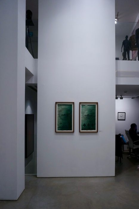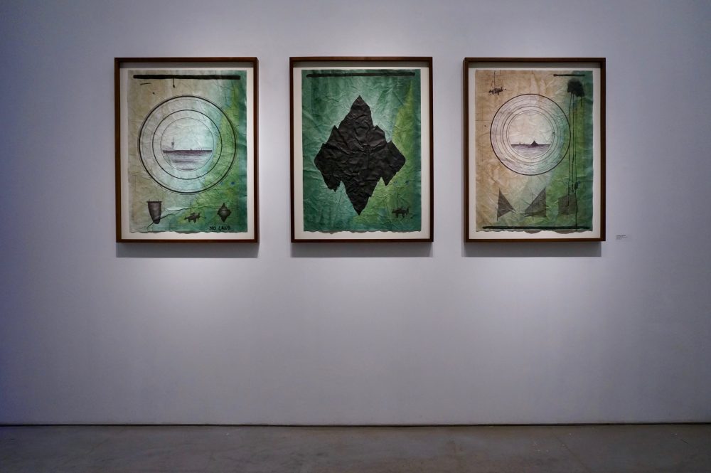 Alongside the “field research” he conducted at sea during his journey, the artist also performed survivalist and navigation actions on nautical charts of Israel. These had triggered his interest in maps of Israel and its borders, yet in contrast to the conventional discourse surrounding borders, Goldman wishes to focus on the country’s western border – an arbitrary line separating sea and land. As the sole border that is not manmade but rather a natural border, Israel’s western border is in fact absent from the public agenda. This is one of the things that drove the artist to pause and focus on it, and explore the possibility of finding through it new alternatives for understanding the notion of “border”. Goldman treats maps with different materials, consequently blurring the details that appear on the map. In this process, he leaves a faint memory of those borders, transforming the function of the map from an orienting device to the support of a painting that presents the material aspect of the journey rather than the territory and its borders.