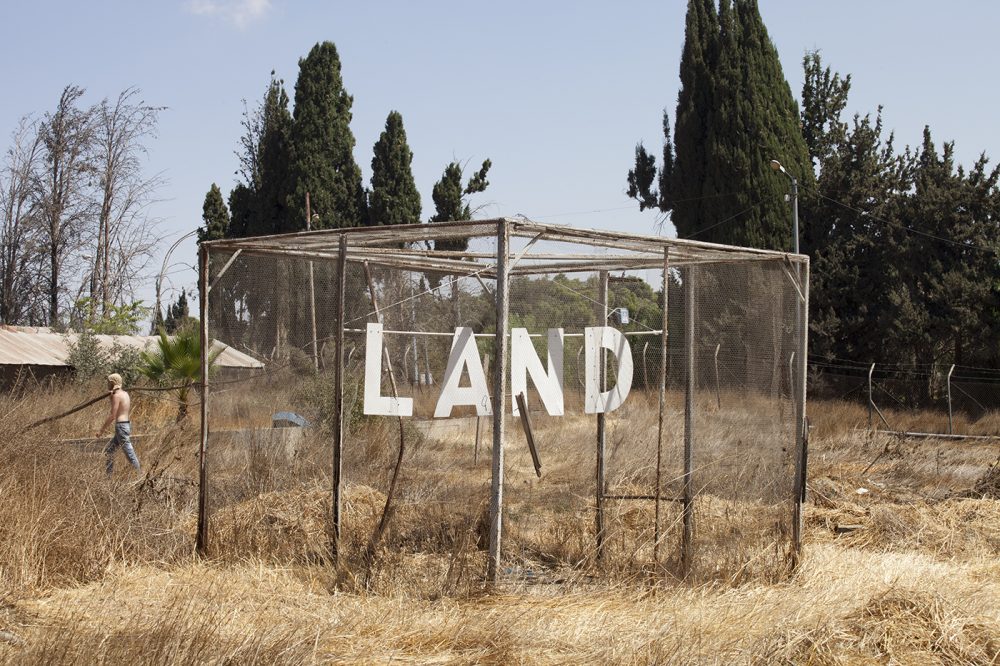 Yairi first made use of the word “land” as part of the phrase “no-man’s-land”. This was in the framework of his activity with the Muslala group – a group of artists and social activists that initiates artistic actions along the Jerusalemite “seam line”, particularly in Musrara neighborhood. Yairi positioned himself in no-man’s-land in the project VISIT NOMANSLAND, which the group held with the aim of performing a typographic artistic action in a topographic space fraught with meaning. In this project he photographed passersby holding the complete phrase, choosing the word “MAN” or “LAND”, or even just one single letter.