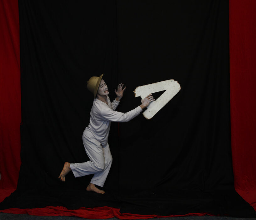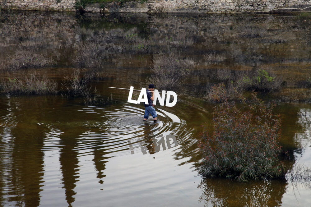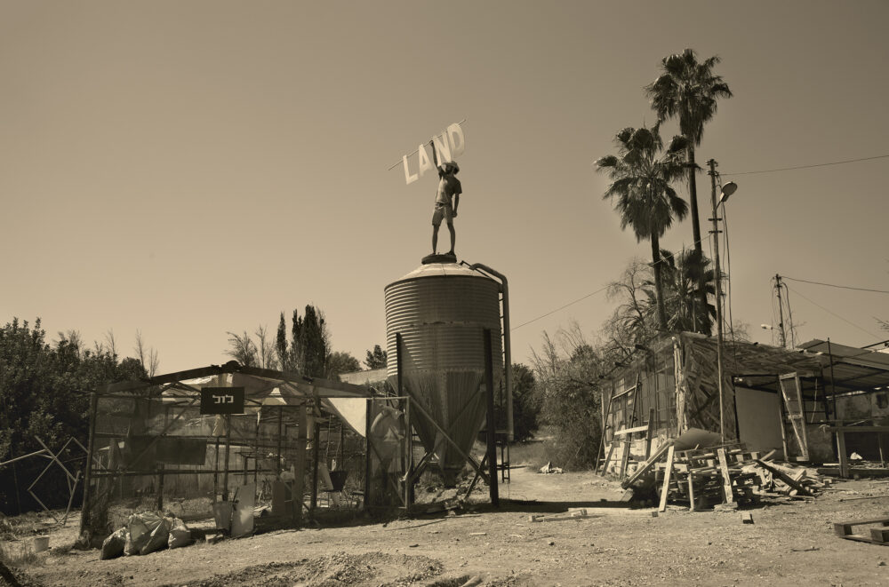 This is the protagonist of Yuval Yairi’s current artistic body of work – the man holding the letters L-A-N-D, the letters of the place.