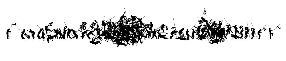 He holds a long pole, like a flag in the hand of a flag bearer or a spear in the hand of a knight, from which hang the four letters L-A-N-D. He then hoists the letters-pole one way or another, and freezes like a black stain against the white background.