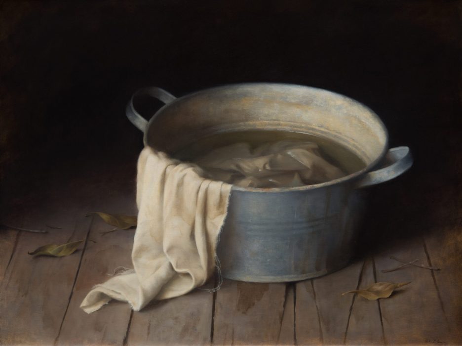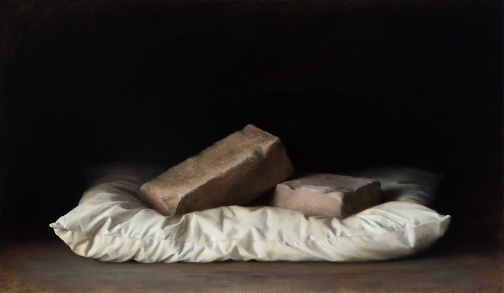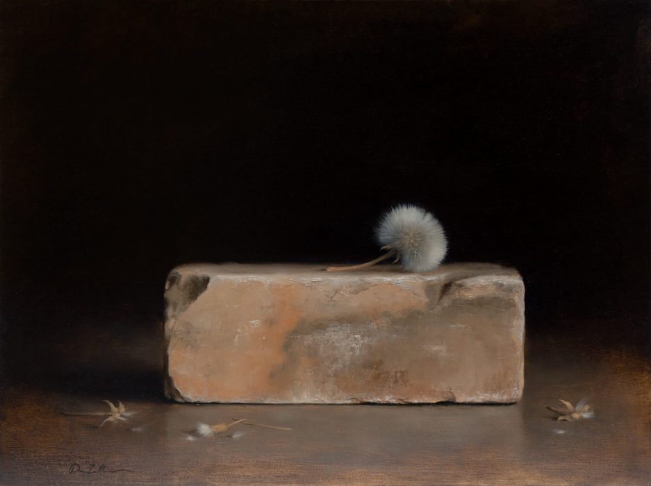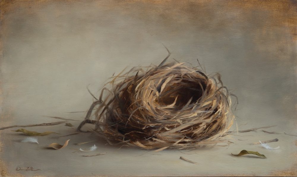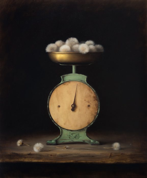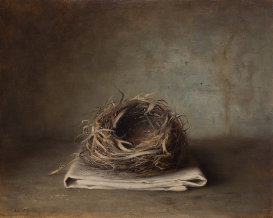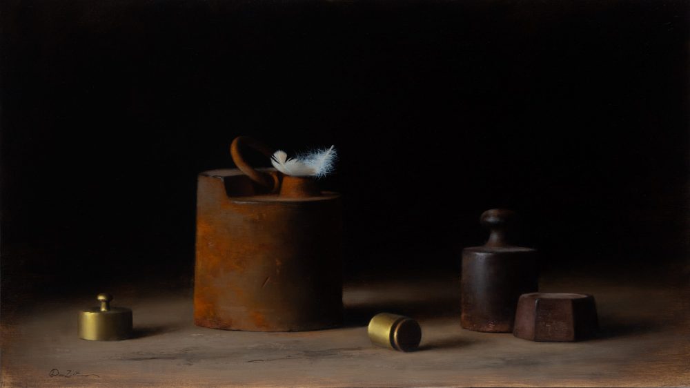 For Zaltzman, the simplest of objects – a scale, a mailbox, a bird’s nest, a brick – is a portal to a rich and elaborate realm of ideas, possibilities, and sentiments. It seems that Zaltzman is fascinated by the straightforward truth of mundane objects. Each such object has a story, a life story if you will, and Zaltzman wishes to present it. However, the trick here is that the object may be simple, but the story is not. In fact, the story is so not-simple that you cannot simply recount it, you have to show it. And so, Zaltzman places the object and its story under the spotlight of traditional chiaroscuro. The traditional treatment of light and shadow is not only a “dialogue” with baroque paintings, but rather plays a significant role in Zaltzman’s painting. The light uncovers, the darkness veils, and one does not exist without the other. There are things in the life story of a brick or a mailbox that are visible to the eye, and there are things that elude it. Light and darkness, visible and hidden, answers and questions, all of these are entangled with one another.