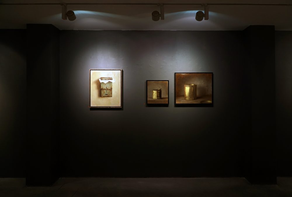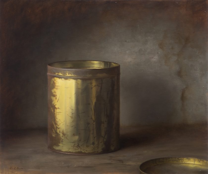 Indeed, one of the keys for deciphering Zaltzman’s painting code originates in an entirely different culture to the Israeli or even Western culture – namely, Japanese culture and a few fundamental principles of Japanese aesthetics. One of these is Wabi, which refers to the beauty of the flawed, to imperfect beauty. In Japanese aesthetics, a beautiful object will look unfinished, imperfect, incomplete even. It shows its flaws, shows that it is still becoming, that it still has not reached the final stage of its being. This perception of beauty is at odds with the notion of classical beauty in the West. In the West, ideal beauty is perfect, eternal. In the West, the classical artwork strives for the absolute, the unchanging, the timeless. In the East, the opposite is true: Japanese classics strive to present a world that is in constant dynamic formation, ceaselessly forming and dissolving. The concept of Wabi is rooted in ancient Chinese Buddhism, specifically in the notion of a world where everything is transient, fleeting, nothing is permanent, perfect, or even finished. When all things in nature, and all the objects we produce, exist simultaneously in the flowing river of reality, the fate of an object – its demise – is already known and embodied in it from its very inception. The Japanese call this “the pathos of things” (mono no aware). This notion indicates an extraordinary sentiment of empathy towards the ephemeral, from the rock-solid to the ethereal, from the metal weight to the duvet feather. In Untitled (2019), we are facing a scratched and beaten golden can, its lid is half closed (half open?). What is in this can? It must be important, since it looks well used. Even the label has peeled off. But, as important as the content of the can was, it must have run out. The open lid already seems permanently open, indicating that this can is past its heyday. Nevertheless, the can is still gleaming. Through the dents and scratches, the can radiates a golden light, illuminating its gloomy surroundings.