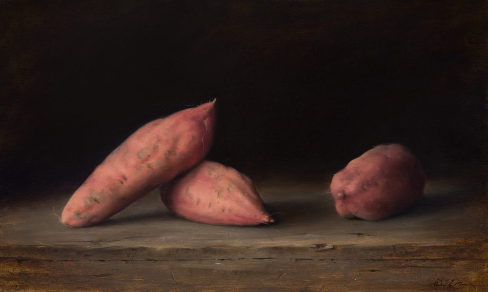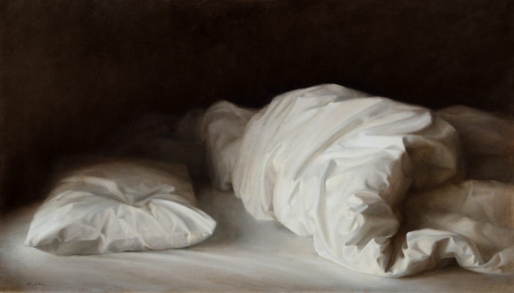 “Weighing feathers?” one might ask quizzically. “Coarse bricks on a pure white pillow?” Purportedly, by painting still life Zaltzman continues a rich tradition of Western painting. Today, many painters are exhibiting a renewed interest in still life. However, in contrast to 17th century Dutch still life masters, who tended to paint precious and exotic objects, many current artists turn to quotidian and not particularly impressive subject matters – a loaf of bread, a pickle jar, a tin of sardines… These painters of everyday life, perhaps inspired by artists such as the Spanish Antonio López García or our own Israel Hershberg, focus on the “here and now,” shifting away from “deeper” meaning held in their painterly language. That is not the case with Zaltzman’s work.