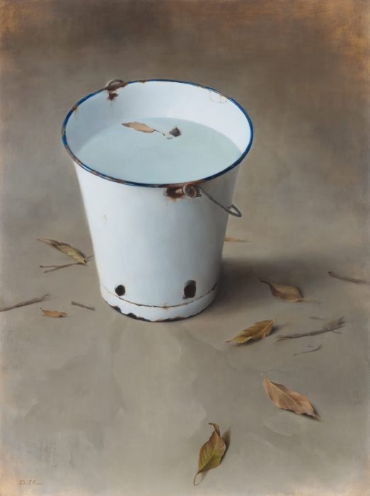 The other key concept in deciphering Zaltzman’s paintings is Sabi – beauty manifested in the surface of things that show their age. The golden can certainly displays Sabi, clearly displaying the marks of its age. The signs of age are in fact the history of the object’s life inscribed on its surface, like medals of honor awarded by the army of life. The quality of Sabi is evident in the painting of a mailbox (Mailbox, 2018), a box that has seen better days, the rust and peeling paint recount its story. It is not just that this simple box was once shiny and new, it was also significant: It proudly represented apartment 10, displaying the family name at its bottom (already faded by now, “Keiser”?), it received the important mail messages. However, mail itself has also become obsolete and now old, unclaimed letters are carelessly shoved into the slot of the old mailbox. (It should be noted that in Zaltzman’s mailbox, as well as in Japanese aesthetics in general, Sabi and Wabi often go hand in hand, creating an encompassing notion of Wabi-Sabi).