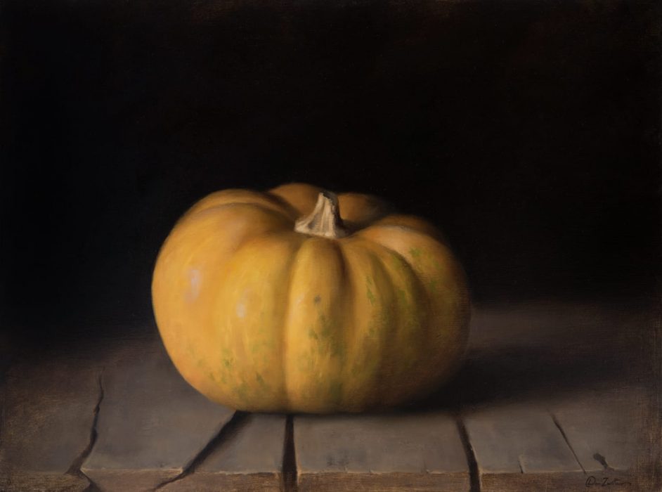Thus, in the painting Weight (2019) for instance, the two sets of cultural ciphers, the European and the Japanese, function well. From the West, the painting is a contemporary still life of a prosaic object – a weight – focused at the center of the canvas. As though taking center stage, it is a heavyweight actor illuminated by dramatic chiaroscuro. Even though it is cast in cold iron, it displays a patina of fiery rust. In certain places, its metallic surface is evocative of the surface of the Sun, yellow-orange stains glimpsing through the iron oxide. So heavy that it leaves its round imprint on the surface beneath it. Despite its weight, it wears a single white feather, like the fancy dress hat of a coquettish debutante. The light feather is illuminated by an aura of extremely light, extremely cool blue-grays. With that Zaltzman creates a union of opposites – light and dark, heavy and light, hard and soft, warm and cold… Such opposites and their relationship served as the conceptual core of the 19th century Romantic movement in the West. Light and darkness, reason and emotion, nature and culture, life and death, all these were popular themes in Romanticism. From this perspective, one can recognize the Romantic nature ingrained in Zaltzman’s paintings.