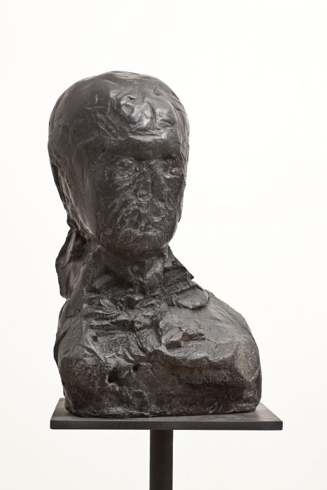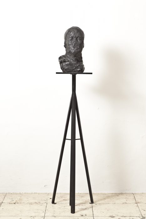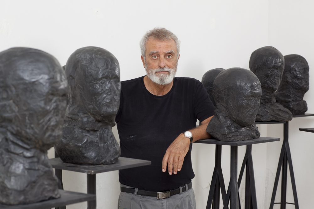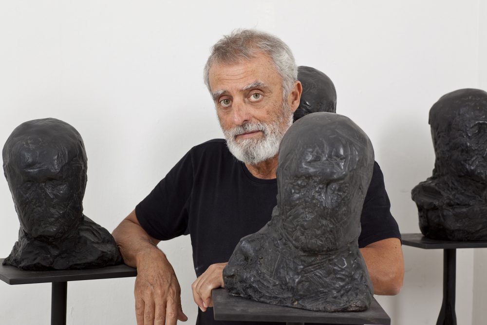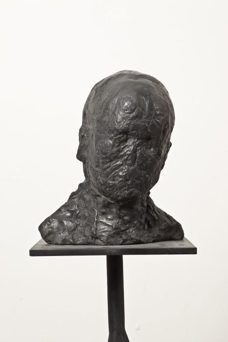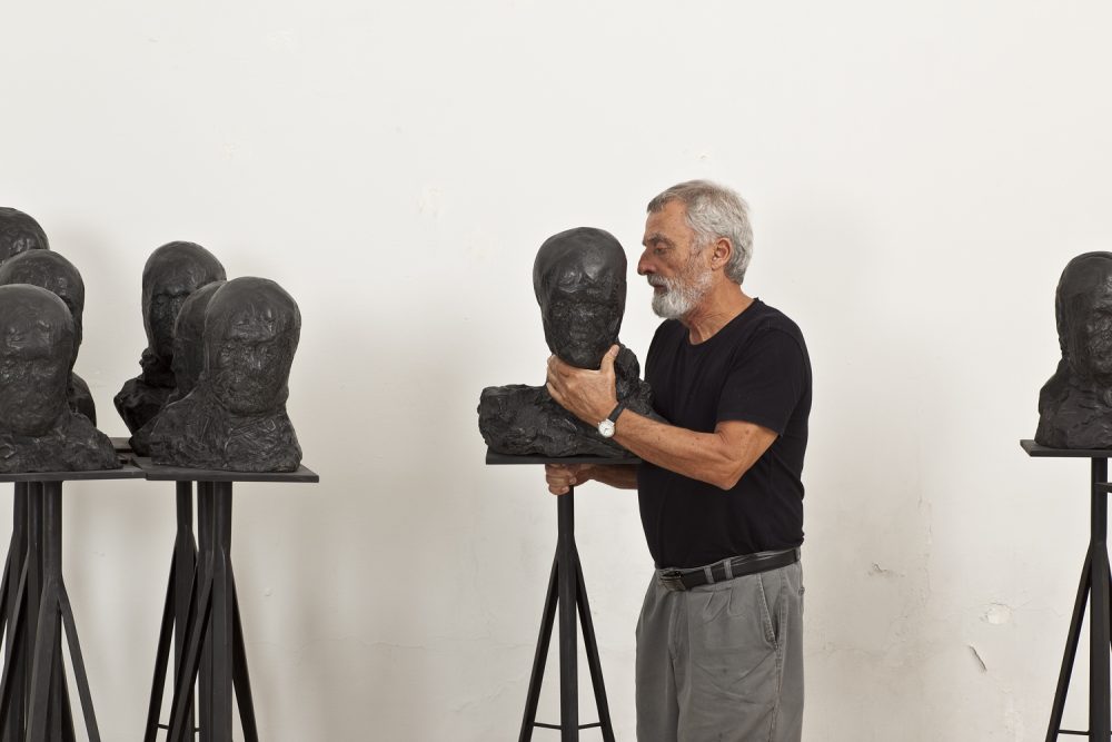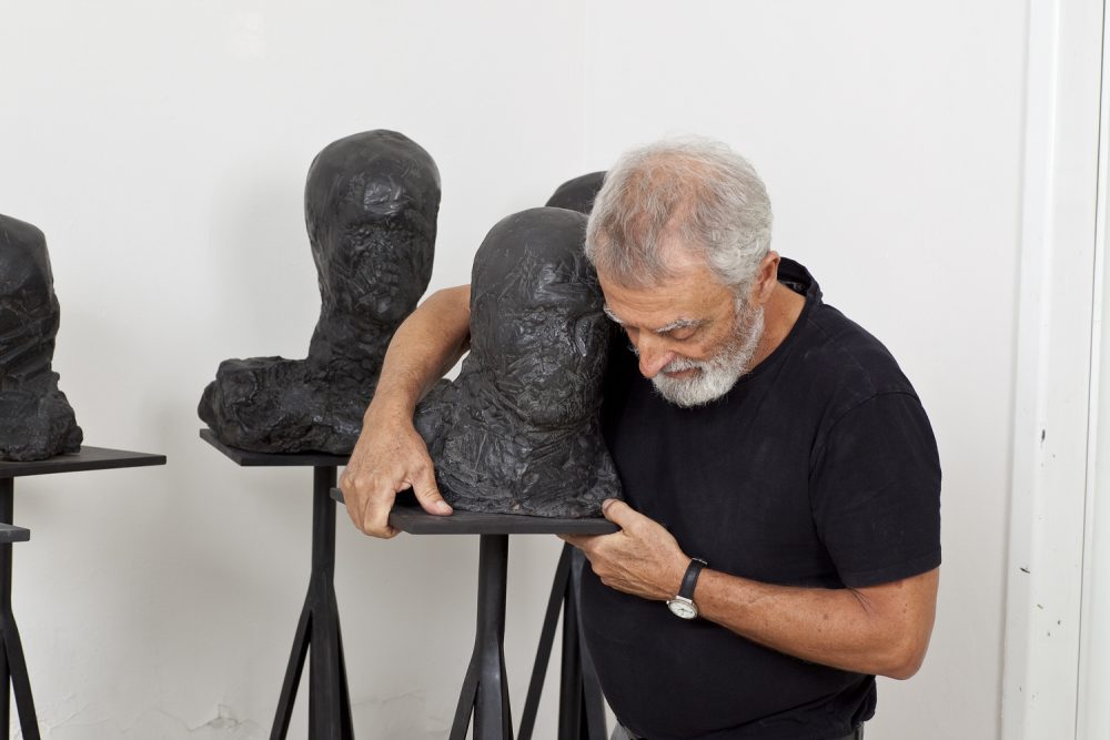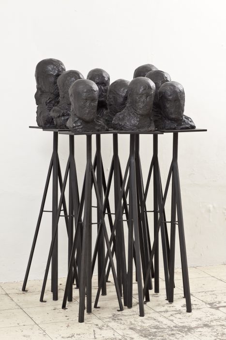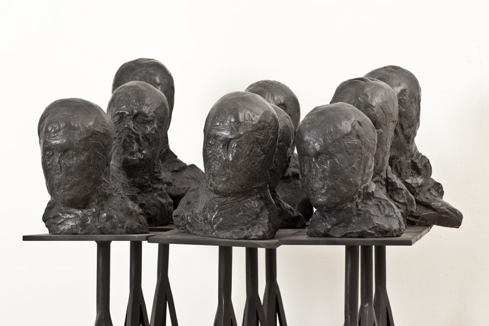 The series Nine comprises nine head sculptures which are in fact one – the self portrait of Ofer Lellouche. His entire oeuvre, in painting, drawing and print, as well as in sculpture and relief, breaks down the unity of his figure and head to countless heads of himself, nine of which stand before us. Apart from their shared subject – the portrait of the artist – the nine were also executed in one mold which Lellouche sculpted and then cast 20 times. He subsequently found himself standing like a commander in front of a squad of identical clay sculptures in his image, which he then worked on before choosing the nine that will be cast in bronze.