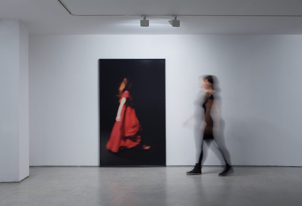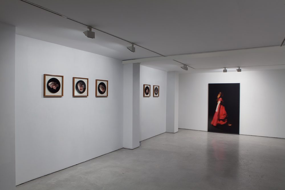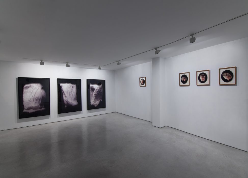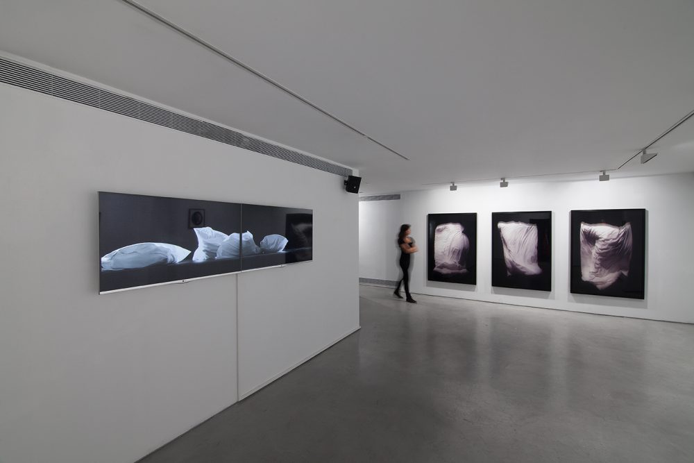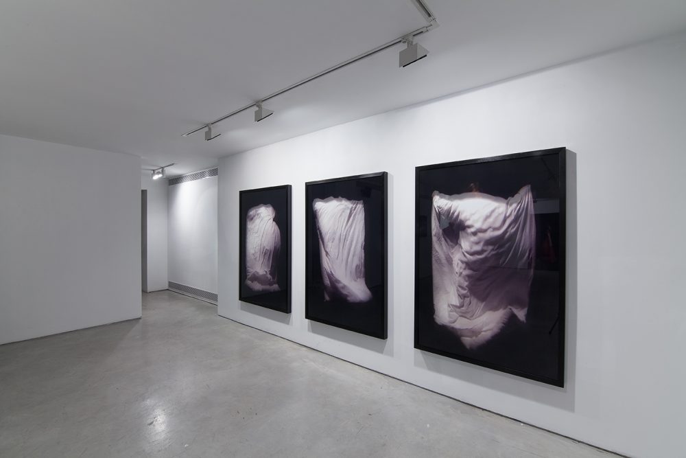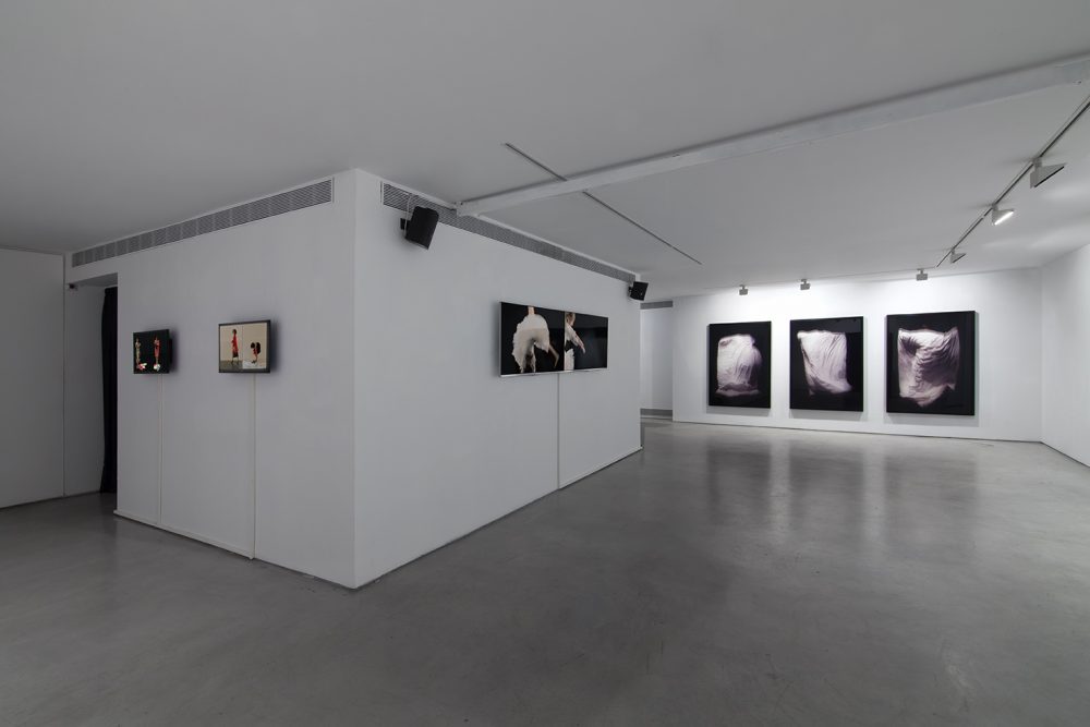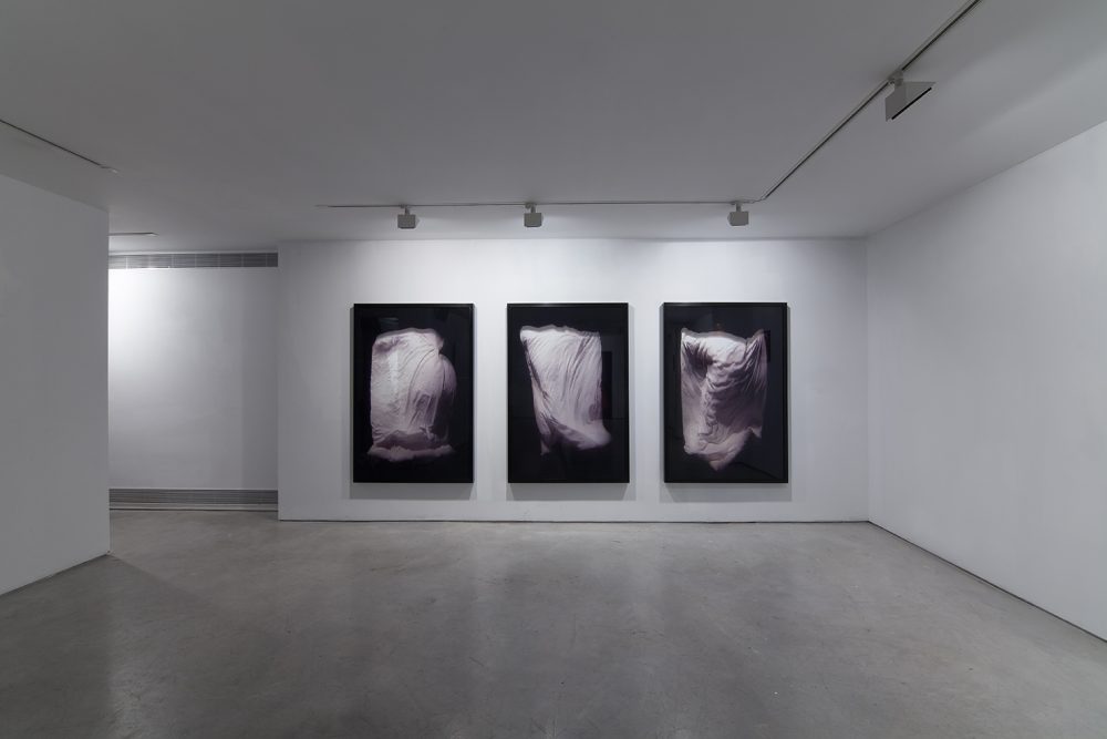 In the lower level of the gallery Yanor offers a more distant observation, a series of casual remarks on representations of women and femininity that demonstrate an anachronistic attitude. The series of photographs entitled Blankets corresponds with the material approach of ancient classical sculpting, in which sculptors found an interest and a challenge in a realistic portrayal of rich draperies that veil the nude body. In this series, the female body is almost completely absent, leaving only glimpses of exposed fragments (a pair of hands, a small part of a head) and the place of the feminine silhouette is replaced by a solid mass of inanimate material simulating a sculptural stone. Beside it we find the series of photographs Dresses. While it does not feature any nudity per se, the series alludes to a veiled sexuality, when what at first seems like an almost abstract image turns out to be the inside of a girl’s dress, hovering in the middle of the frame empty and bodiless. The image, presented from a low perspective that exposes the hidden side of the dress, holds powerful beauty alongside latent violence.