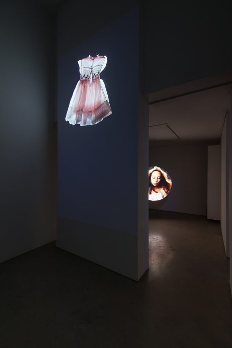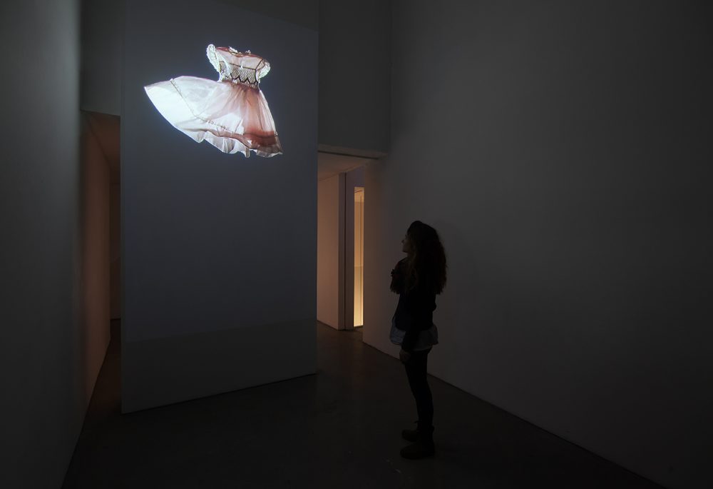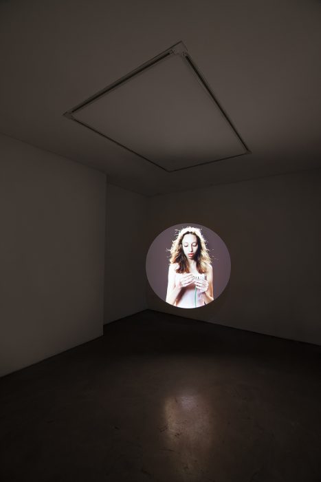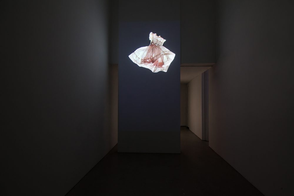 The video work Lenny focuses on the figure of a girl who exudes innocence and tenderness, like a renaissance Madonna on a medallion. The girl is seen gracefully picking petals off a flower, bashfully mumbling questions about love; little tentative questions of adolescent fragility contemplating a future promise. At her side we find the video Homecoming, which portrays a girl’s dress floating in a disturbing cinematic slow-motion. Trapped in an indefinite temporal space, the orphaned dress brings to the fore an uncanny feeling that generates discomfort and disorientation in the face of something which is paradoxically familiar and foreign at the same time.