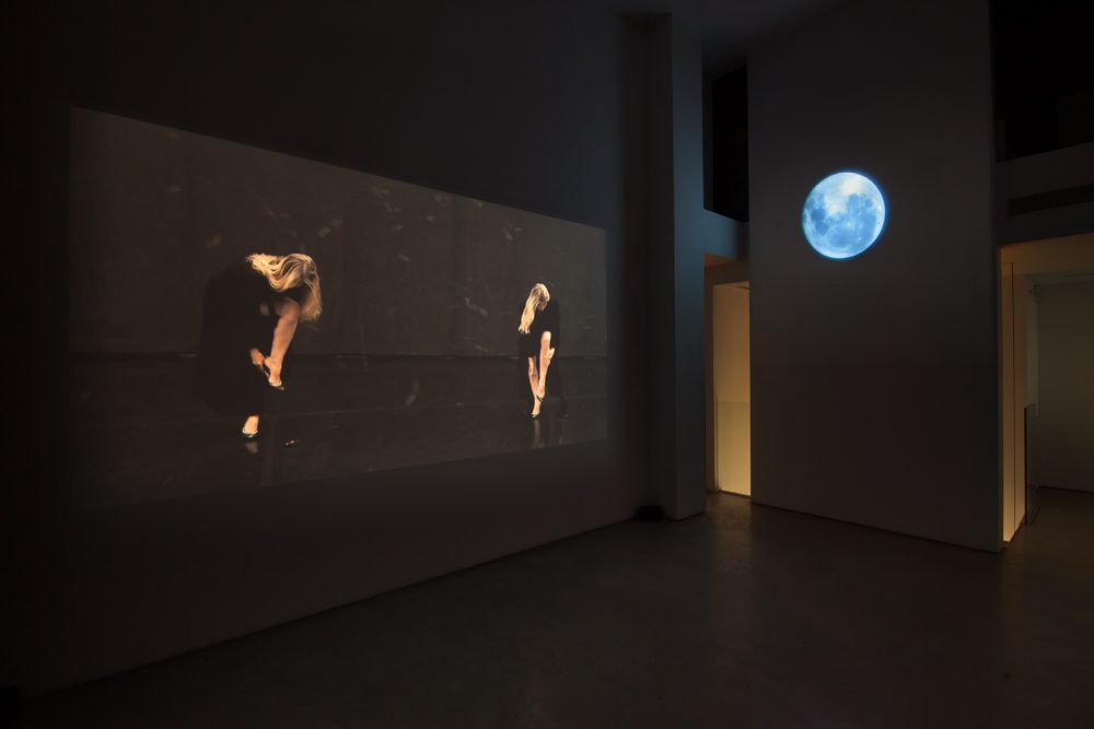 The video work Full Moon, presented at the entrance to the gallery, serves as a key to the entire exhibition. The figure of Barbara – a mature dancer and actress –emerges in all her beauty in several short acts, like in a surrealist play. Besides her flickers an image of a full moon that imbues her image with mystery and melancholy. Some of her actions are purposeful, and others are performed by inertia, revealing freedom of action like that found in theatrical improvisation. Barbara presents a determined and poised position of acceptance of the passage of time and its signs. She summons intimacy that grows from familiarity, and embraces processes of change from a place of completeness. However, at the same time she is also moonstruck Barbara – free and unpredictable, with a lust for life and freedom – who looks at the past reflected through the two adjacent works: Lenny and Homecoming.