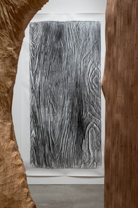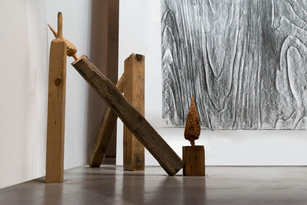 Taken from the practice of archeology, which attempts to overcome historical gaps, the artist attempts to bridge the industrial gap between manufacturing methods and consumption, thus pointing at the specific tree as a life form, which has been cut short.