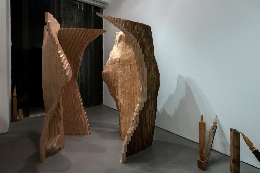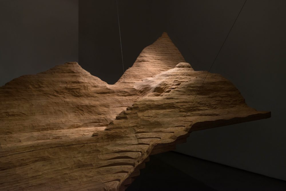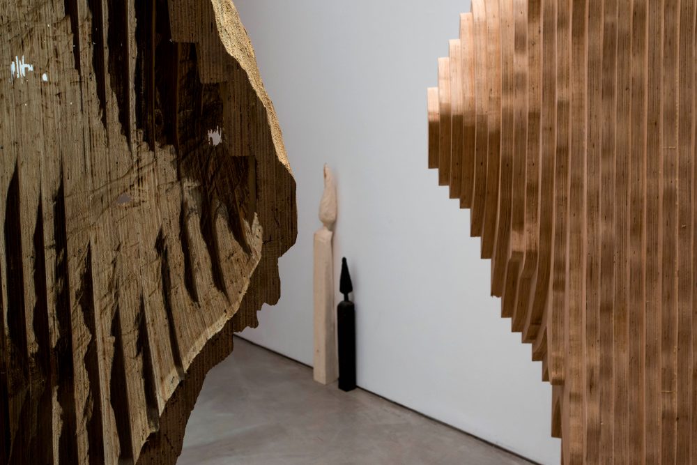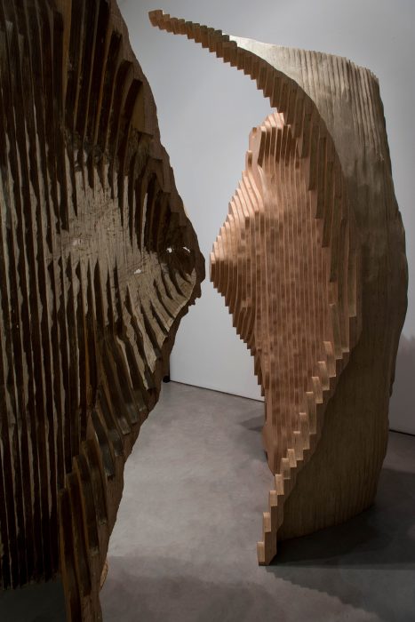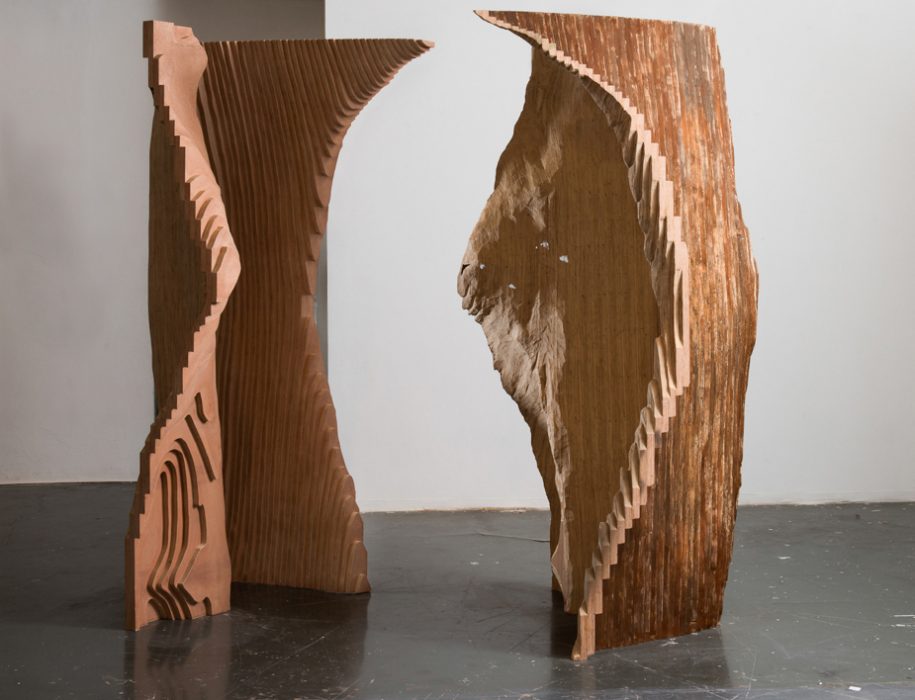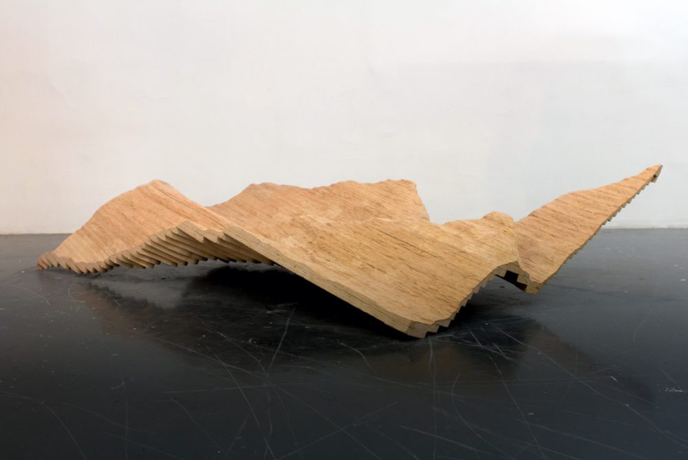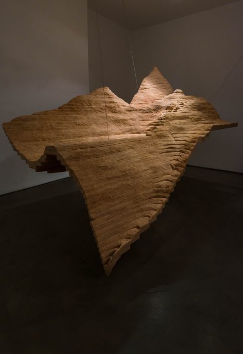 The installation Okoumé, was initially conceived when the artist recognized a similarity between the texture of the plywood and the lines on a topographical map, those indicating the height of planes, according to a set scale. Similarly, the artist treats the plywood as though it is a map describing lost territories. By assembling pieces of the plywood together, the artist recreates a three dimensional map from the two dimensional sheets of wood, thus describing in a sense, the original tree from which the wood originated.