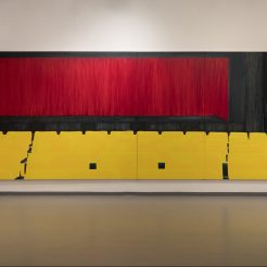 This time, the work intrudes upon an architectural space that was not taken into account at the time of its creation: the lower floor of Zemack Gallery. Here, the walls are met by close-fitting pillars that divide and separate each of the painted corners of her pieces from the walls. This new separation changes the rhythm with which we view the work. At any moment, it enables us to look at the painting as a single, individual work, or as a collection of works. It is possible to dive into the composition that exists at any given moment and to discover the colorful blend that exists, only in that moment.